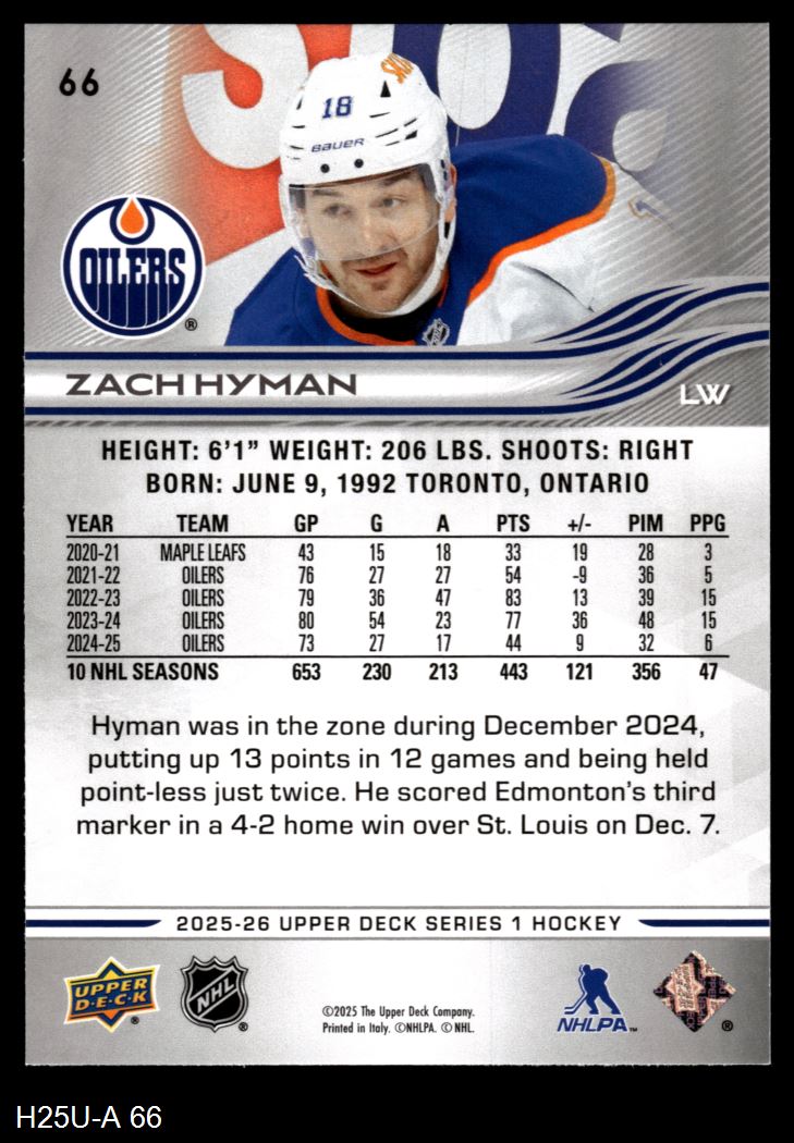 2025 Upper Deck #66 Zach Hyman 8 - NM/MT