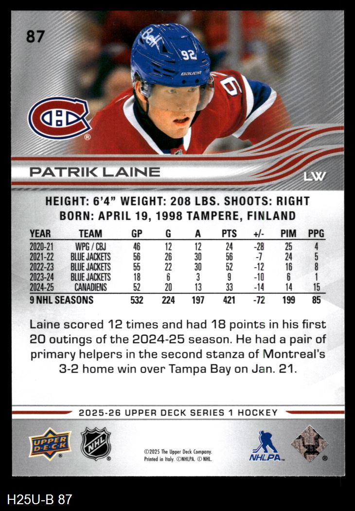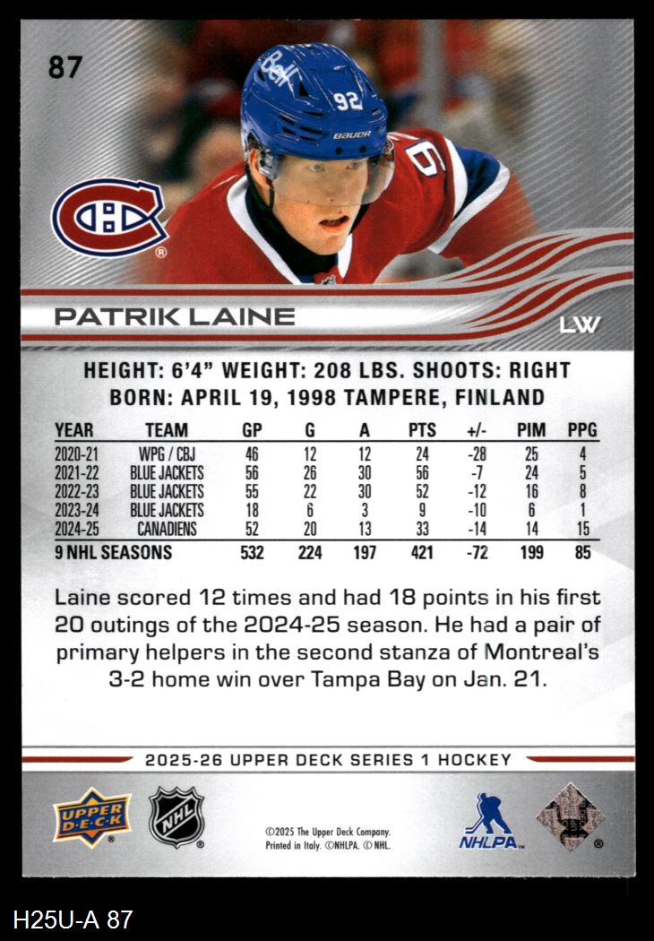 2025 Upper Deck #87 Patrik Laine 8 - NM/MT