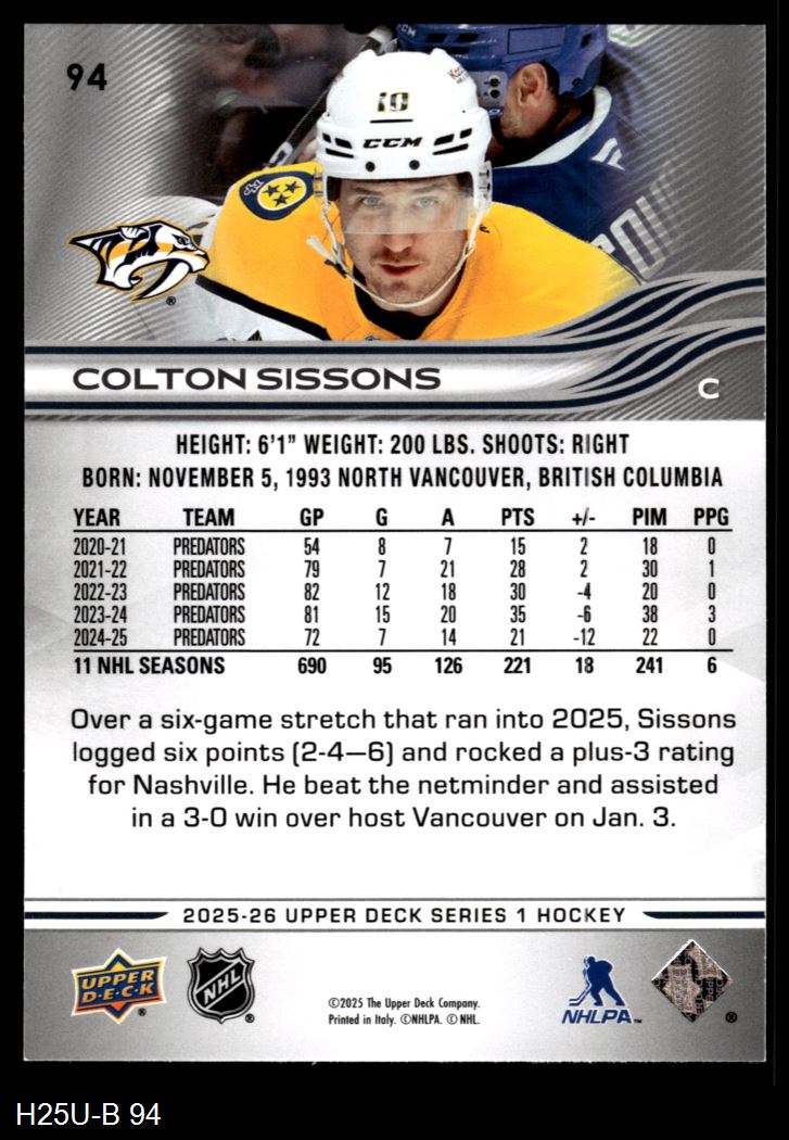 2025 Upper Deck #94 Colton Sissons 8 - NM/MT