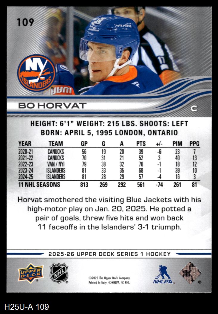 2025 Upper Deck #109 Bo Horvat 8 - NM/MT