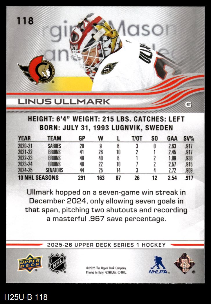 2025 Upper Deck #118 Linus Ullmark 8 - NM/MT