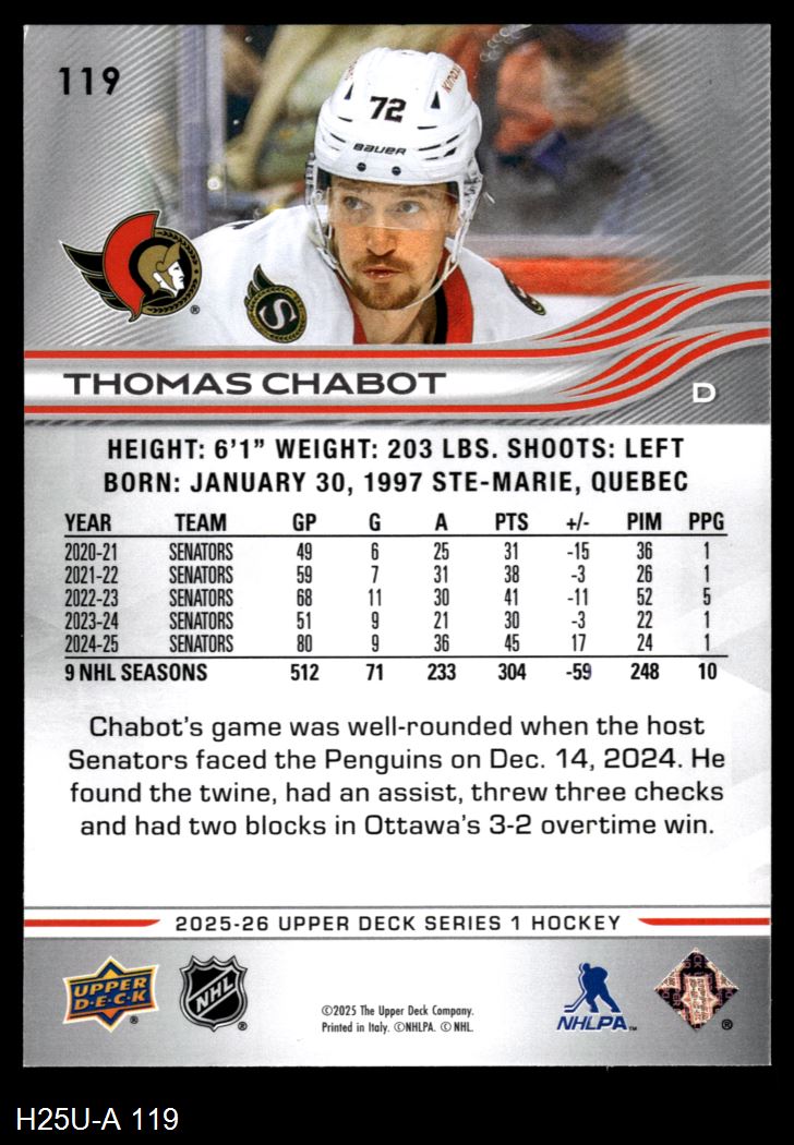 2025 Upper Deck #119 Thomas Chabot 8 - NM/MT