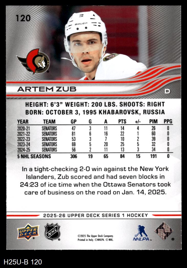 2025 Upper Deck #120 Artem Zub 8 - NM/MT