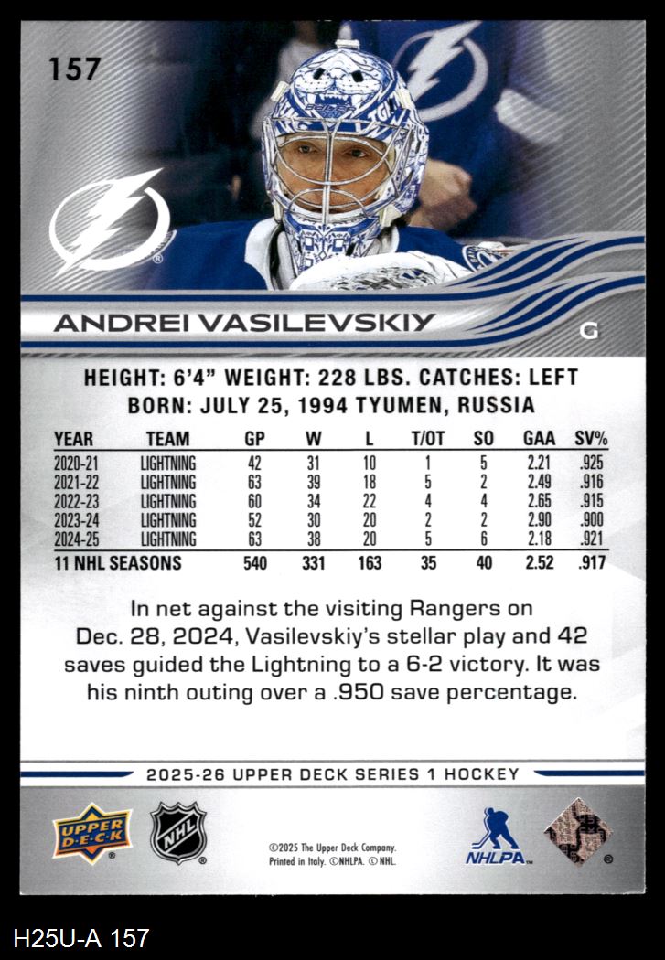 2025 Upper Deck #157 Andrei Vasilevskiy 8 - NM/MT