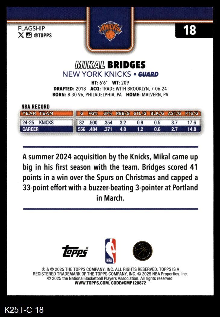 2025 Topps #18 Mikal Bridges 8 - NM/MT