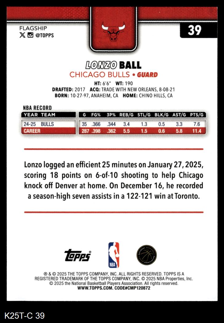 2025 Topps #39 Lonzo Ball 8 - NM/MT