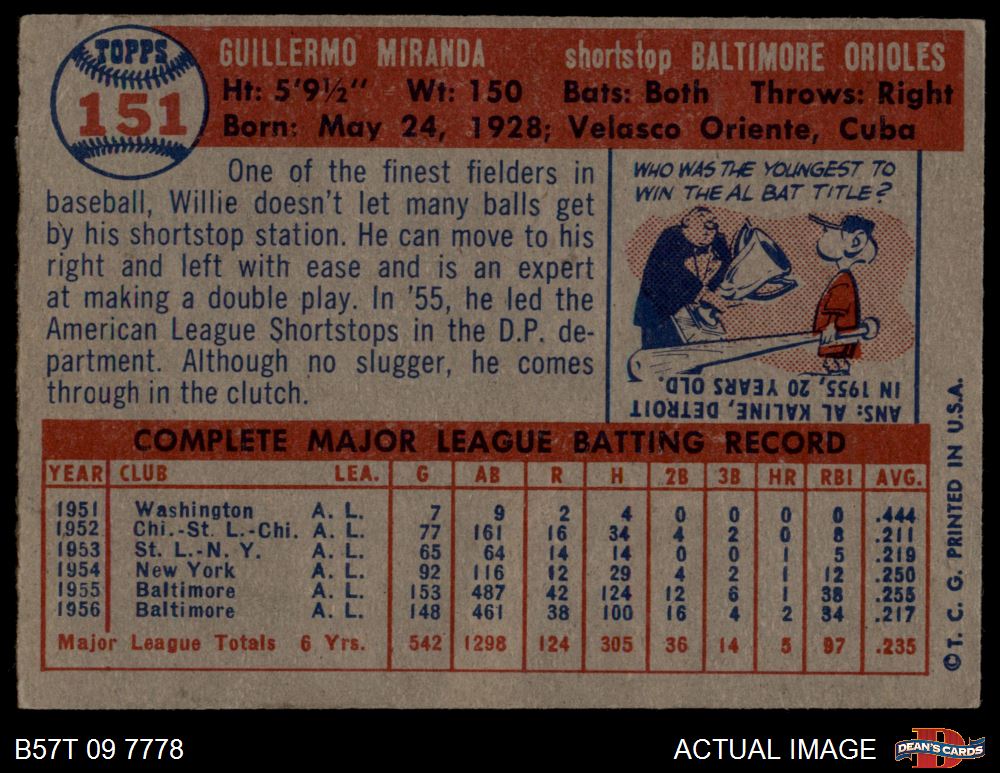 1957 Topps #151 Willie Miranda 1 - POOR