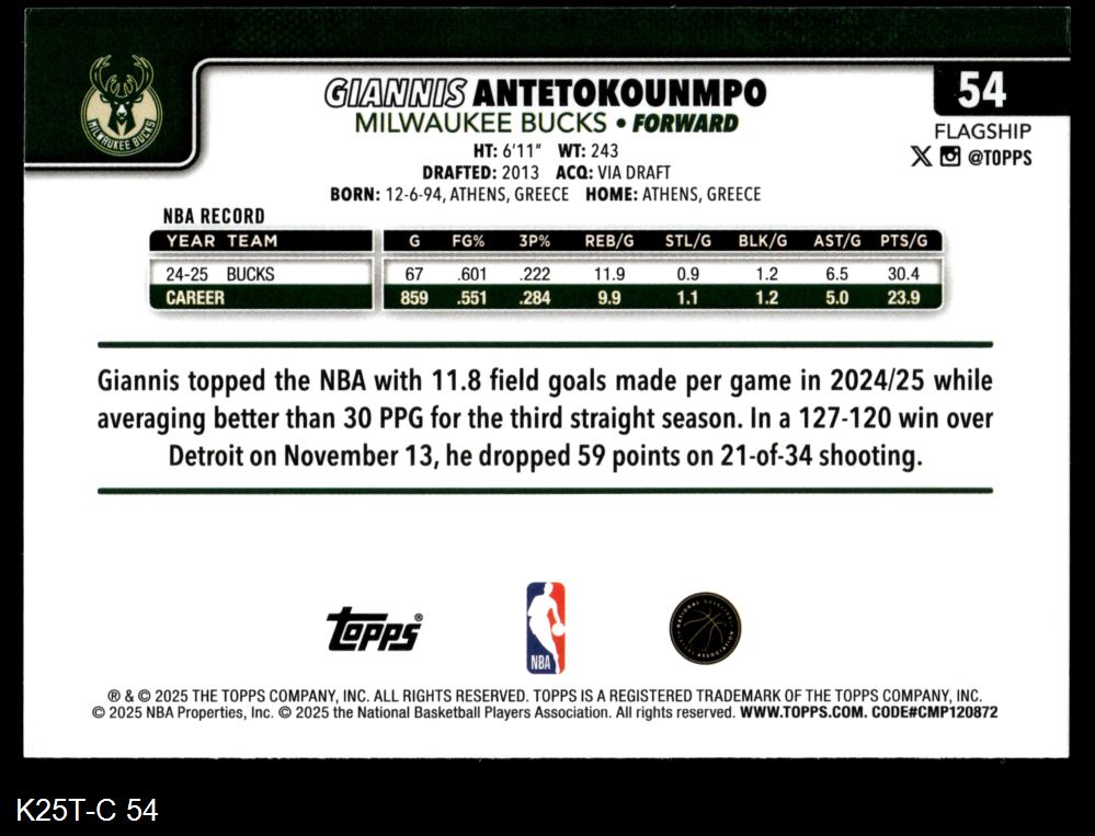 2025 Topps #54 Giannis Antetokounmpo 8 - NM/MT