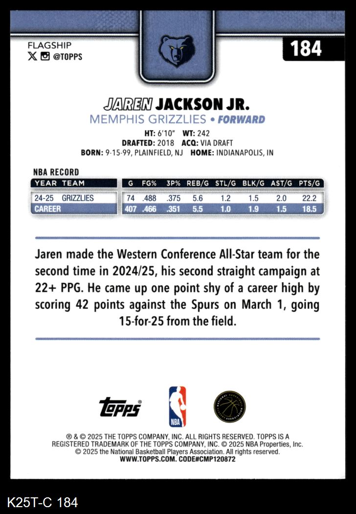 2025 Topps #184 Jaren Jackson Jr. 8 - NM/MT