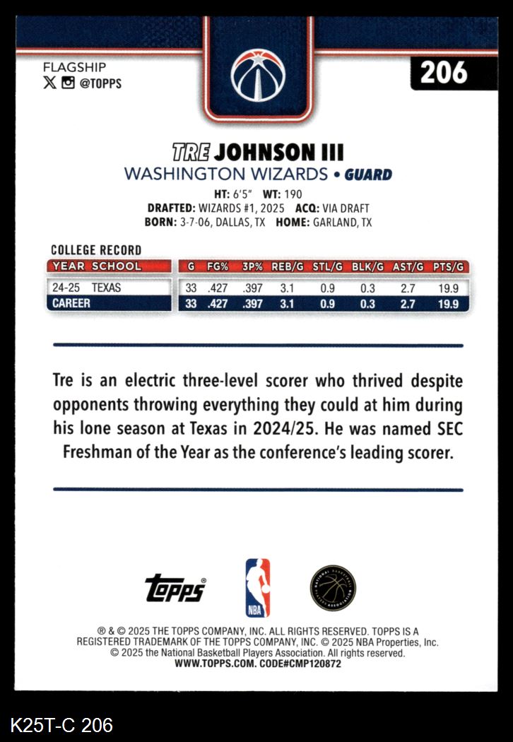2025 Topps #206 Tre Johnson III 8 - NM/MT