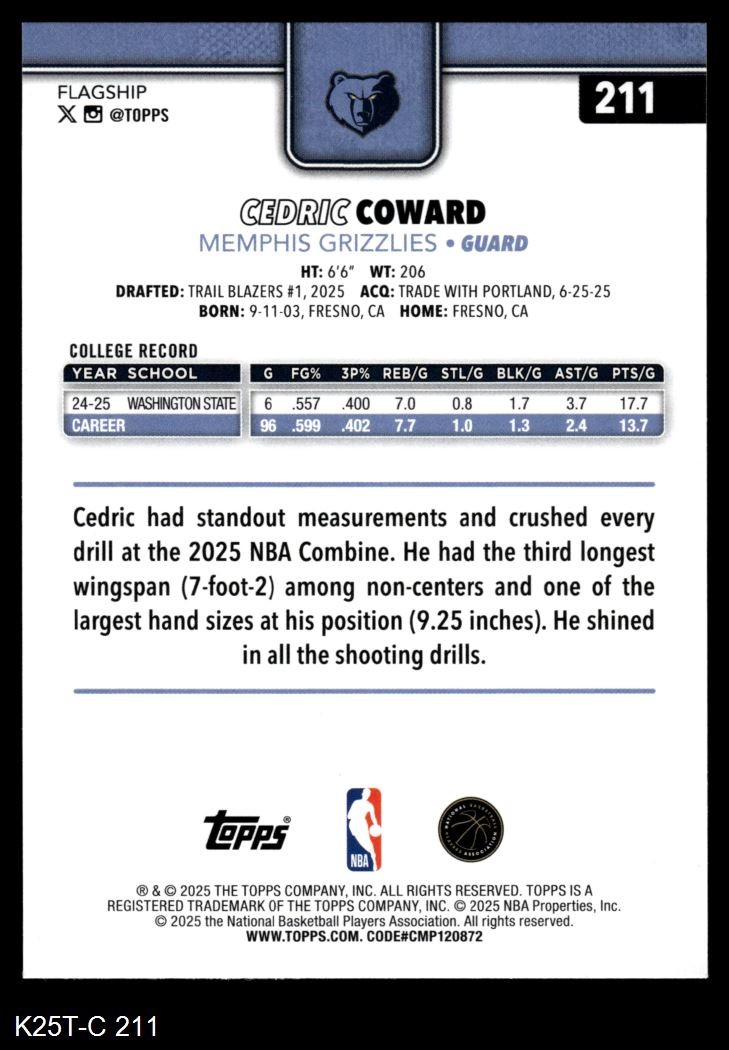 2025 Topps #211 Cedric Coward 8 - NM/MT