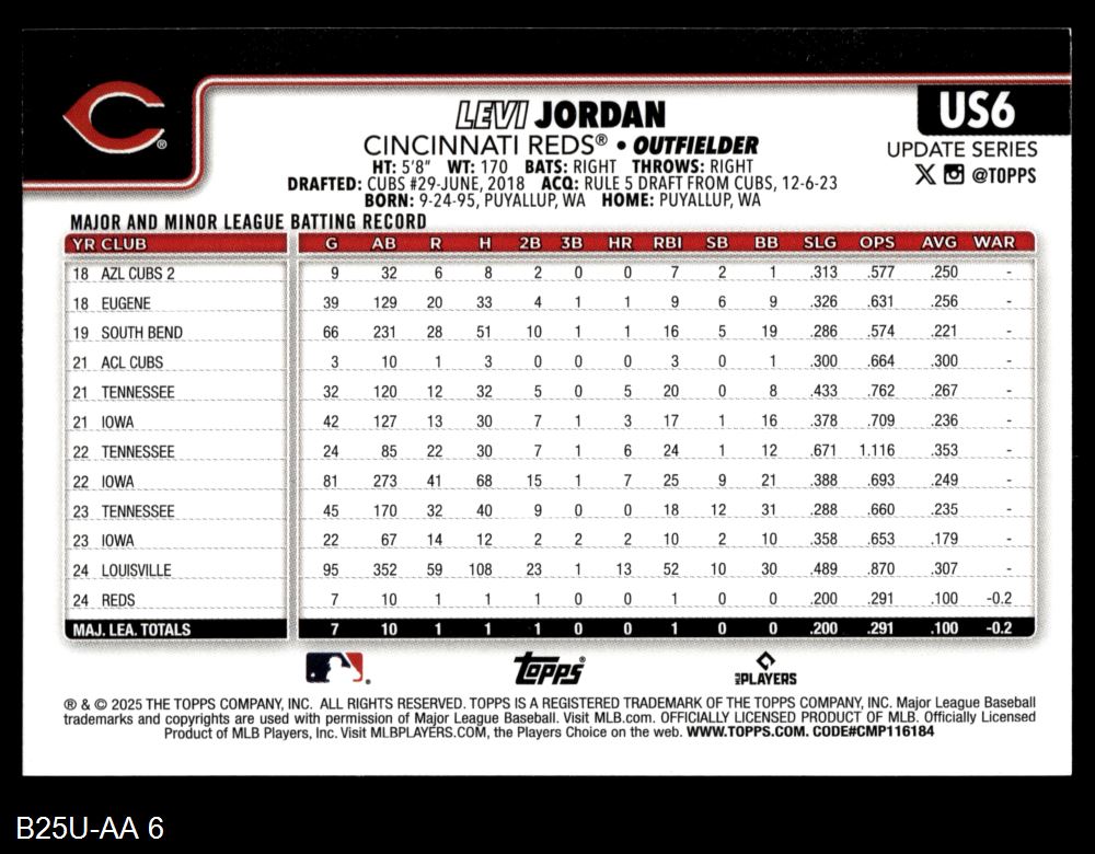 2025 Topps Update #6 Levi Jordan 8 - NM/MT