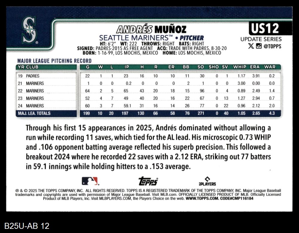 2025 Topps Update #12 Andres Munoz