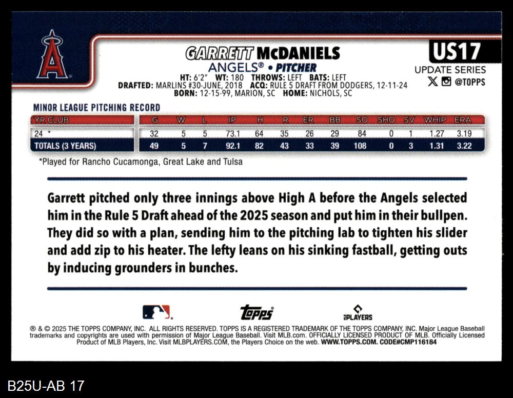 2025 Topps Update #17 Garrett McDaniels 8 - NM/MT