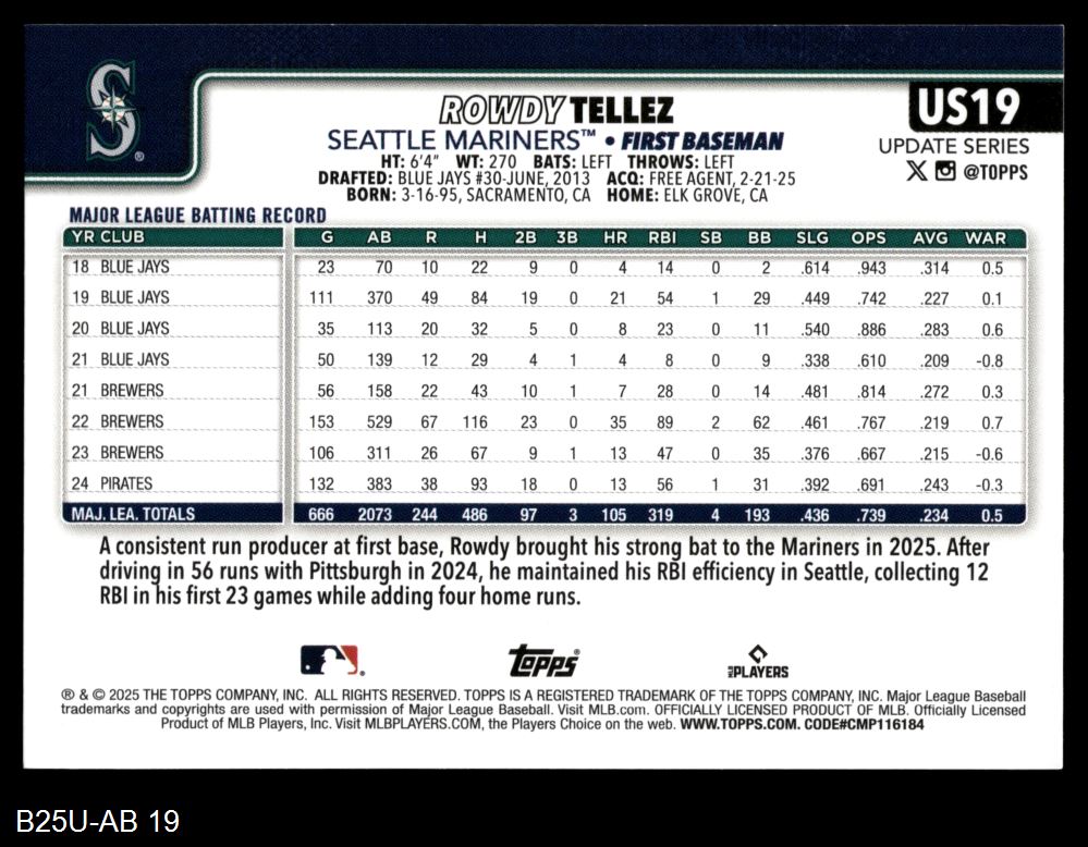 2025 Topps Update #19 Rowdy Tellez