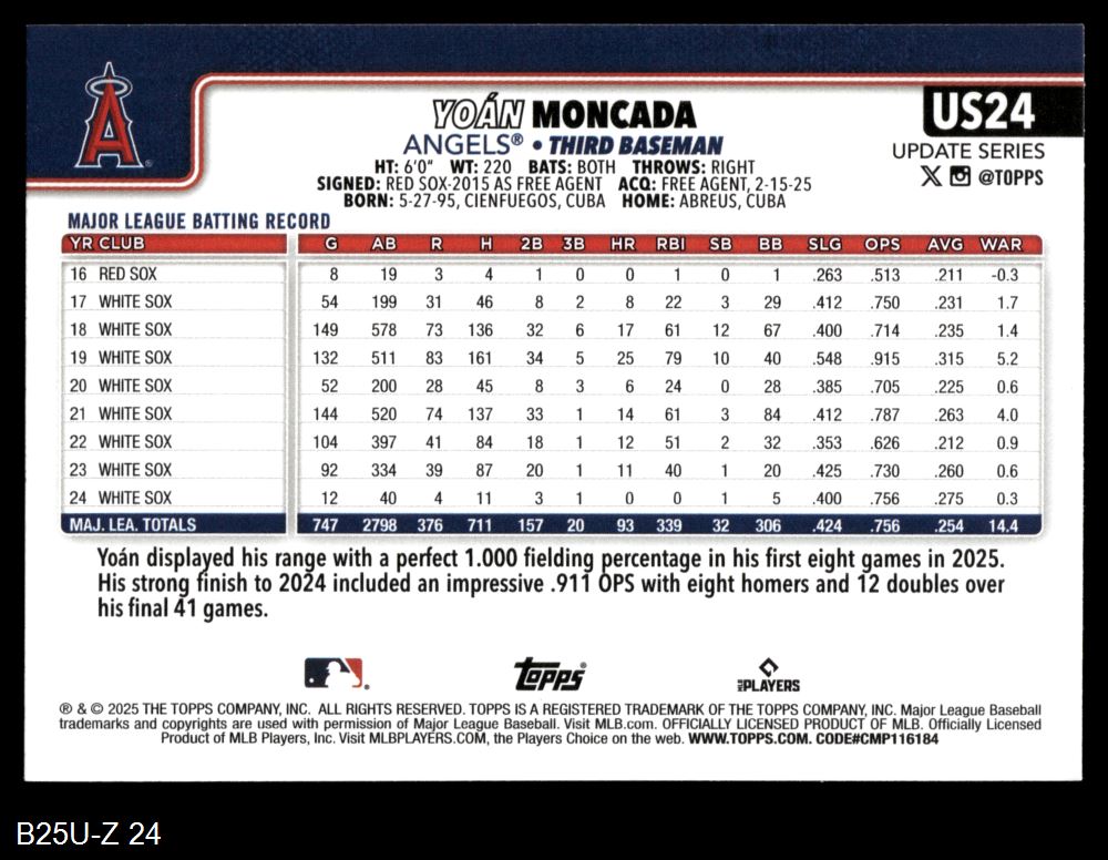2025 Topps Update #24 Yoan Moncada 8 - NM/MT