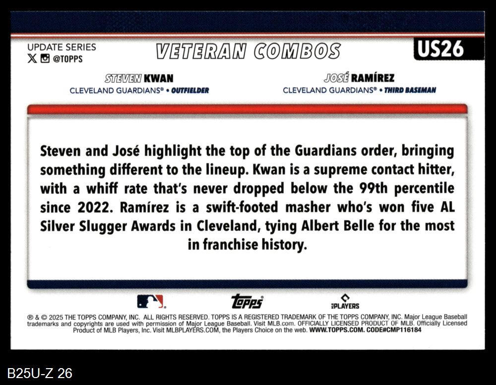 2025 Topps Update #26 - Jose Ramirez / Steve Kwan Combo Card 8 - NM/MT