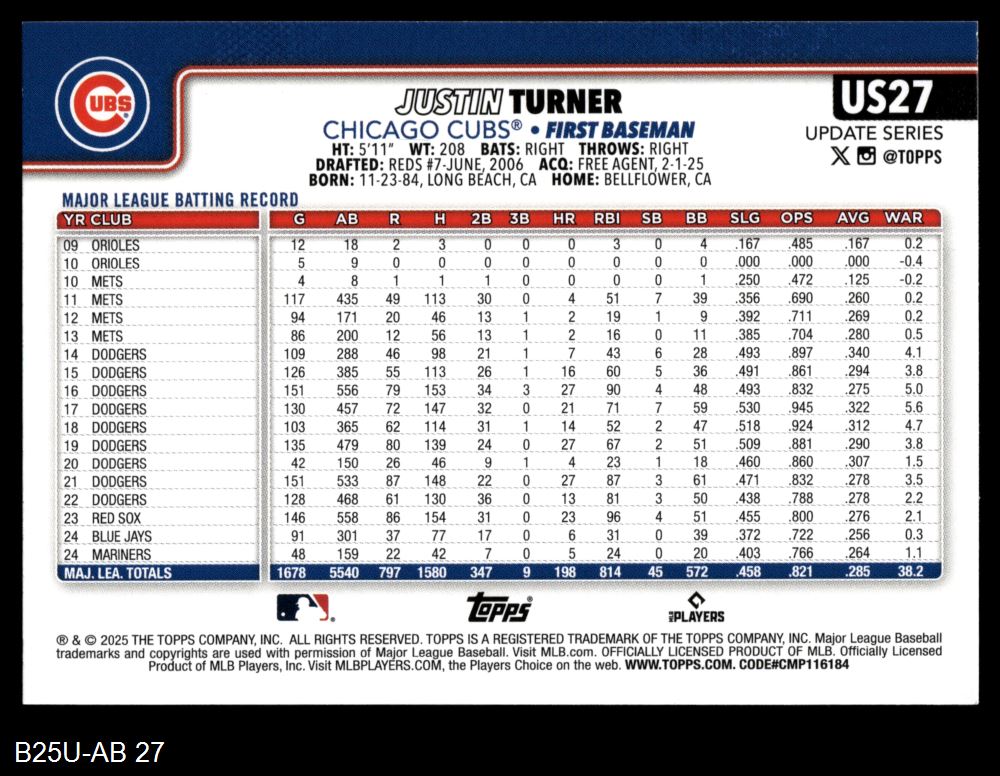 2025 Topps Update #27 Justin Turner