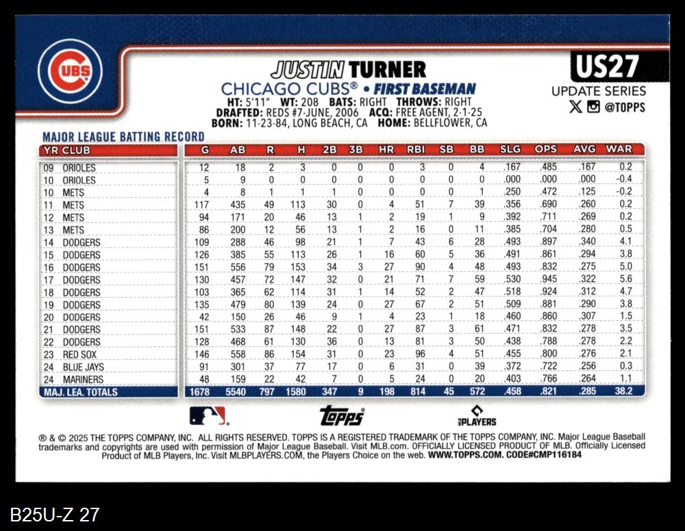 2025 Topps Update #27 Justin Turner 8 - NM/MT