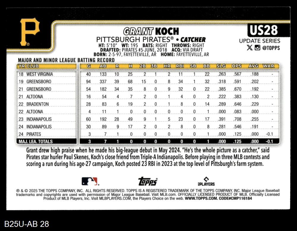 2025 Topps Update #28 Grant Koch 8 - NM/MT