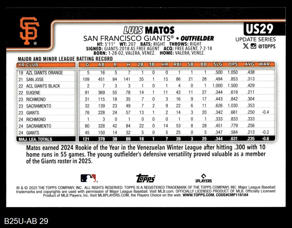 2025 Topps Update #29 Luis Matos 8 - NM/MT