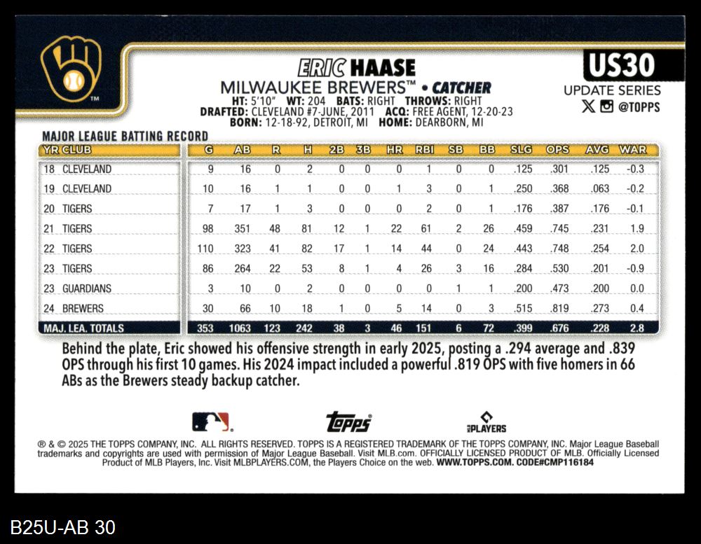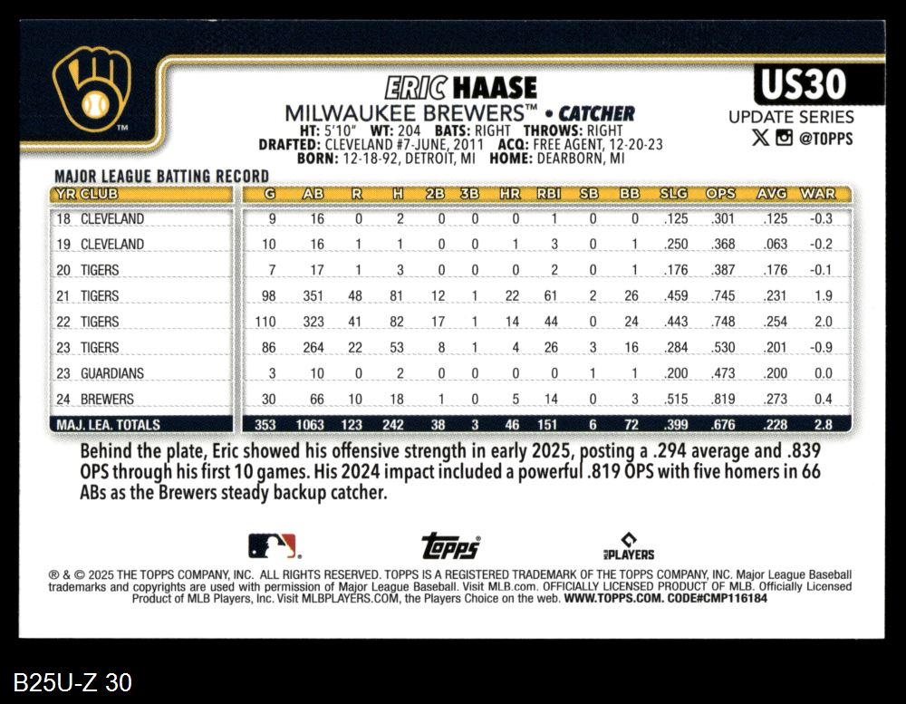 2025 Topps Update #30 Eric Haase 8 - NM/MT