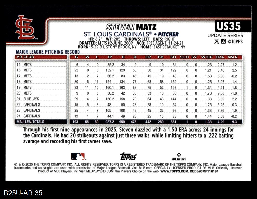 2025 Topps Update #35 Steven Matz 8 - NM/MT