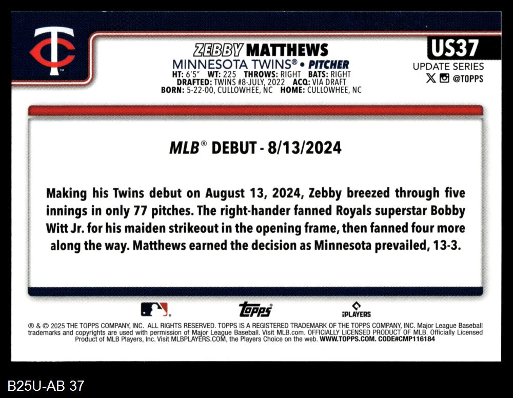 2025 Topps Update #37 - Zebby Matthews Rookie Debut 8 - NM/MT