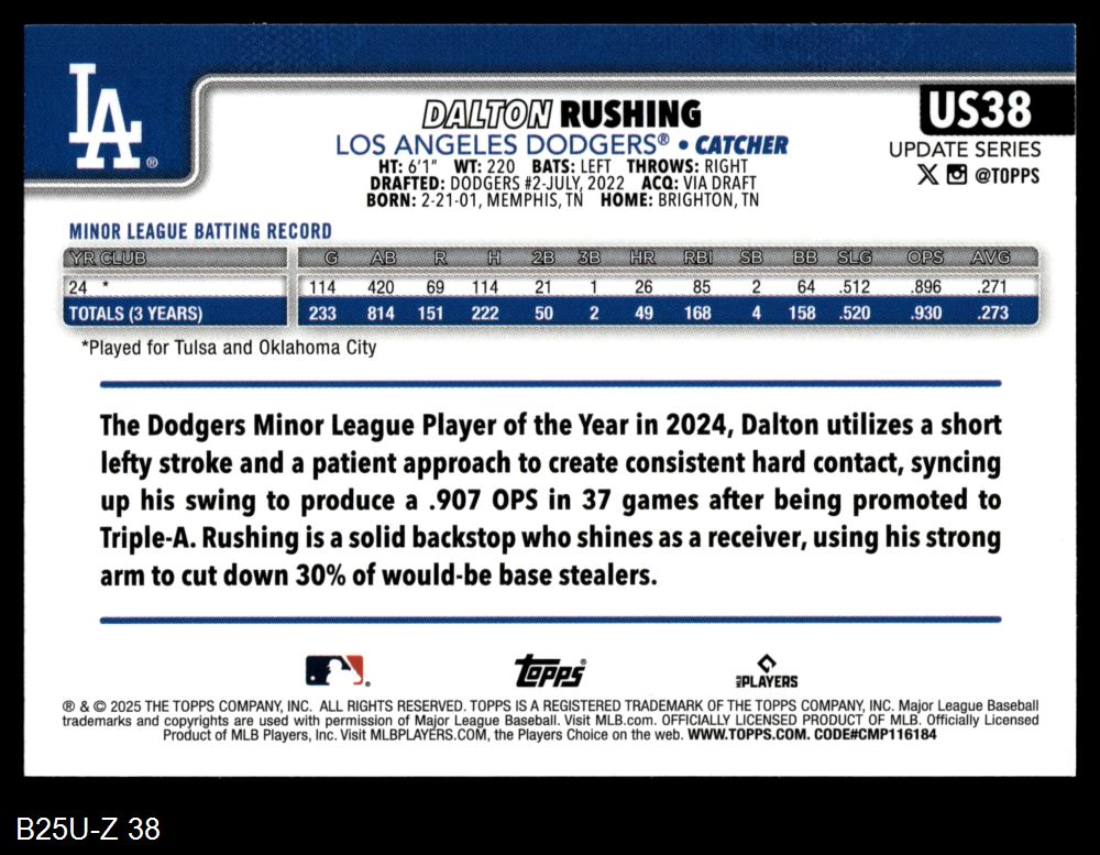 2025 Topps Update #38 Dalton Rushing