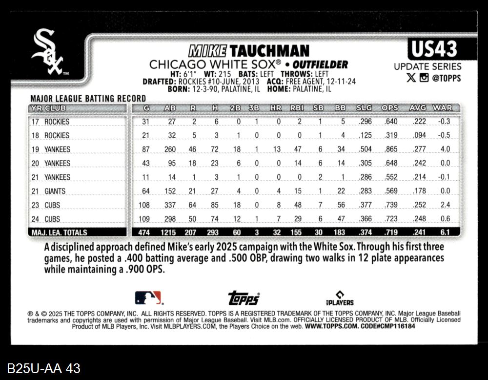 2025 Topps Update Baseball Cards (892 available)2025 Topps Update White Sox (11 available)