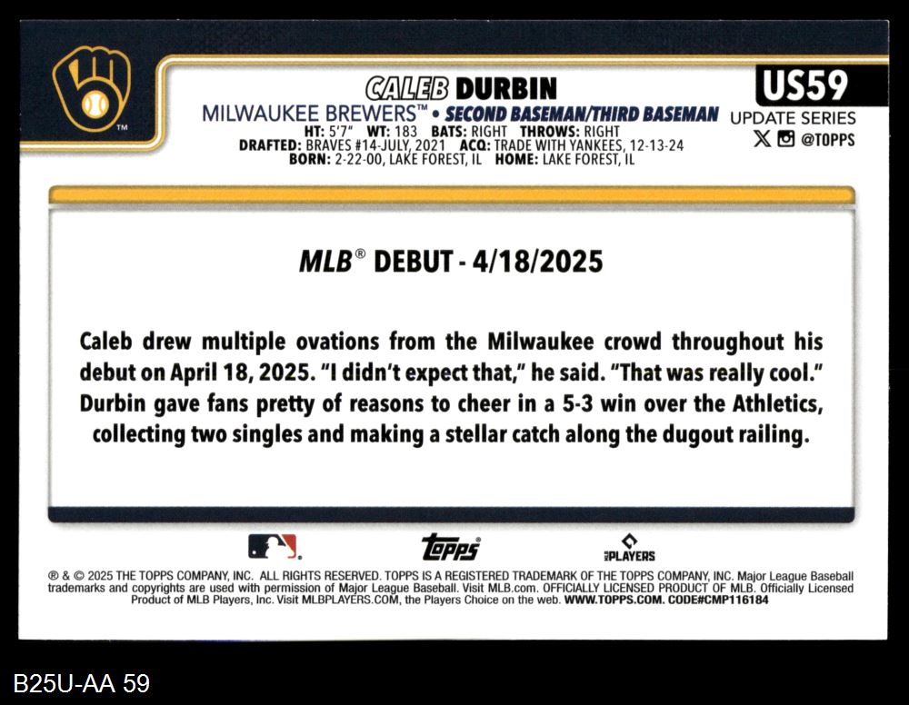 2025 Topps Update #59 - Caleb Durbin Rookie Debut 8 - NM/MT