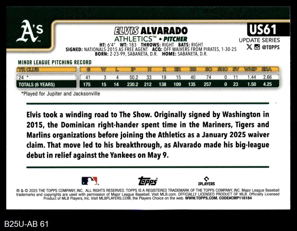 2025 Topps Update #61 Elvis Alvarado