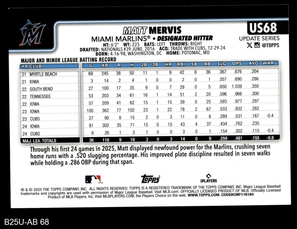 2025 Topps Update #68 Matt Mervis 8 - NM/MT