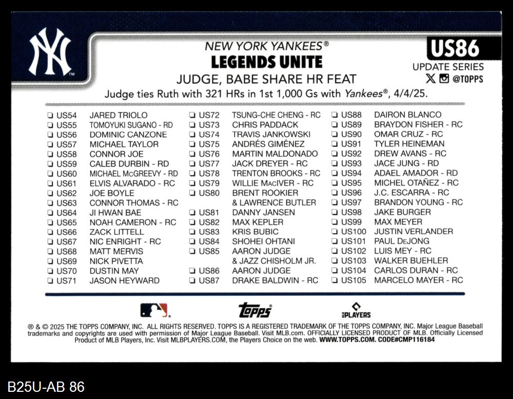 2025 Topps Update Baseball Cards (892 available)2025 Topps Update Yankees (25 available)
