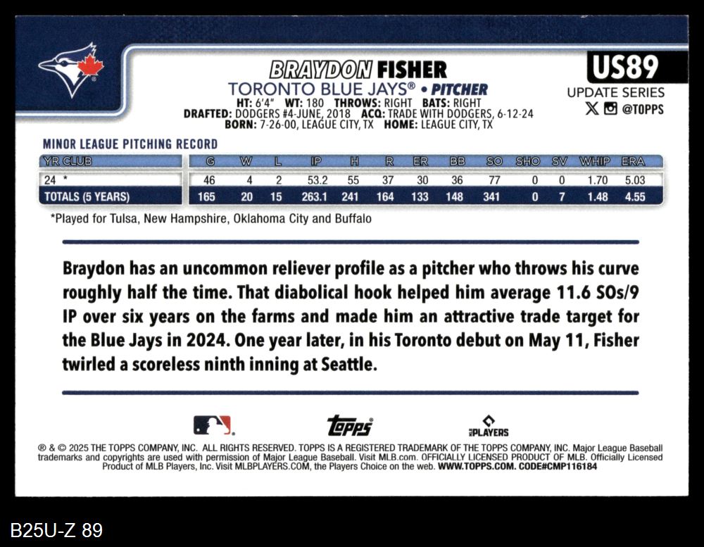 2025 Topps Update #89 Braydon Fisher 8 - NM/MT