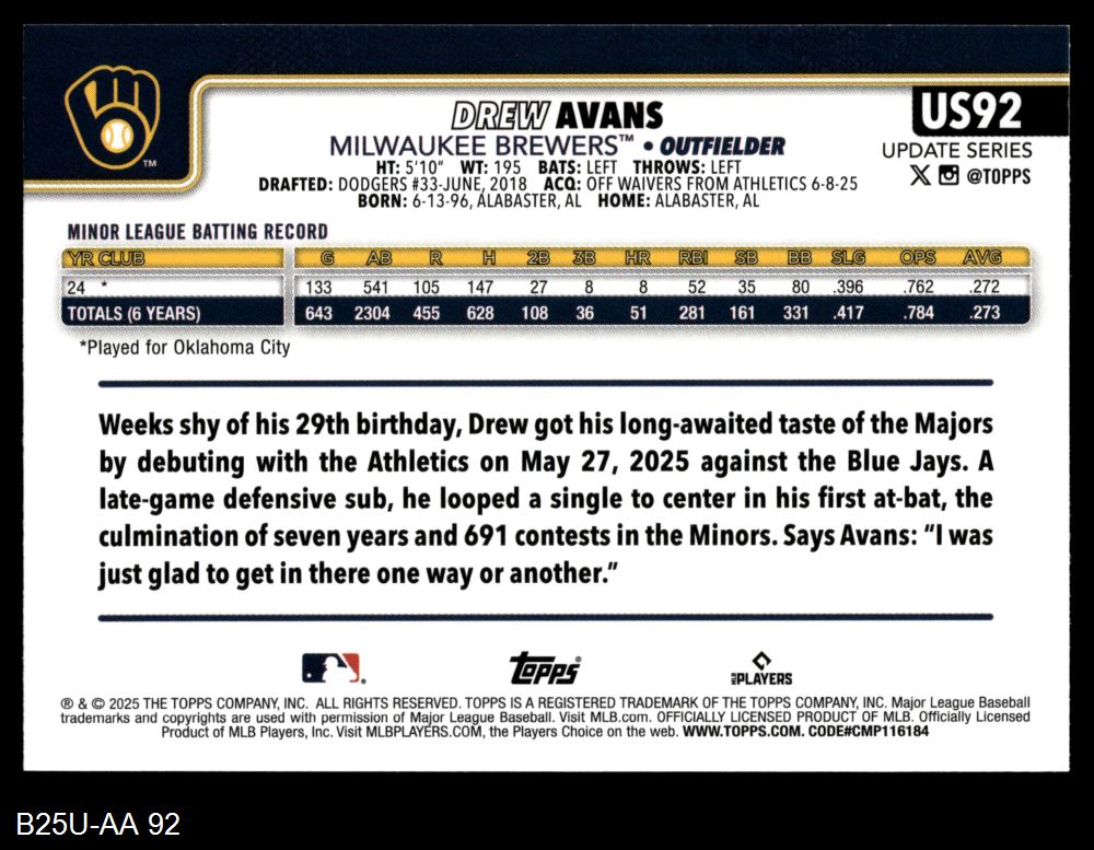 2025 Topps Update #92 Drew Avans 8 - NM/MT