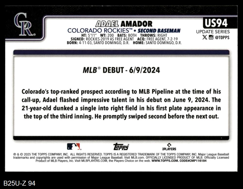 2025 Topps Update #94 - Adael Amador Rookie Debut 8 - NM/MT