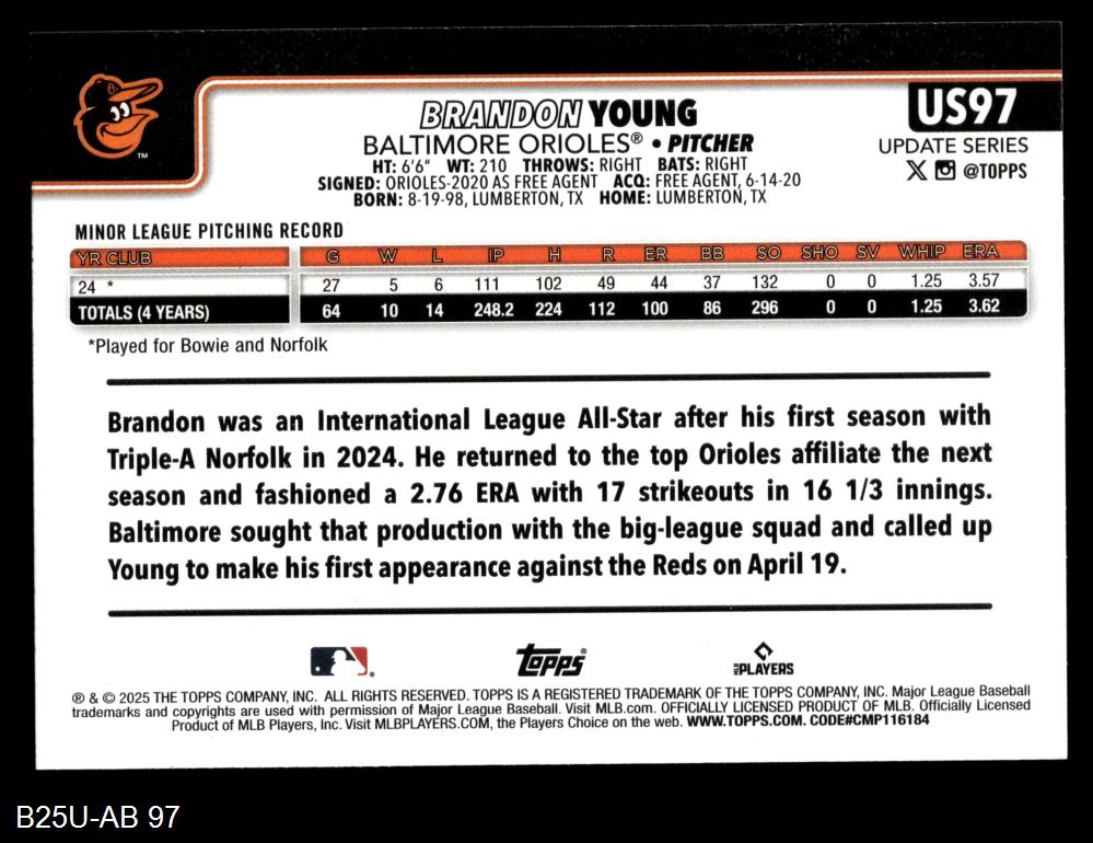 2025 Topps Update #97 Brandon Young 8 - NM/MT