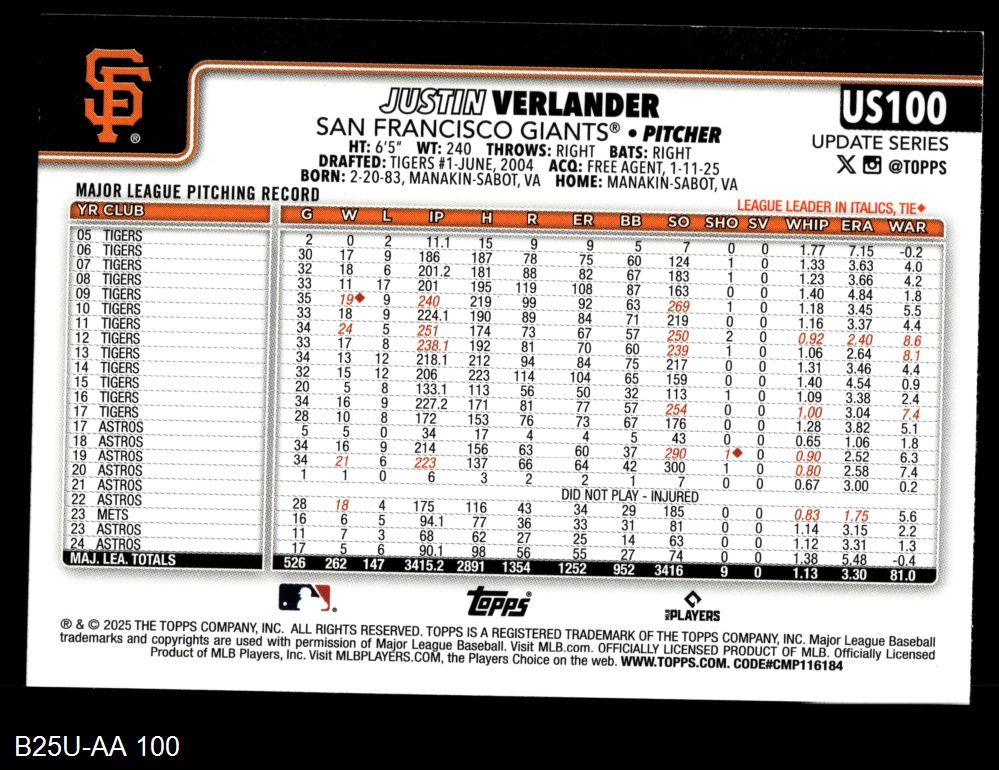 2025 Topps Update #100 Justin Verlander 8 - NM/MT