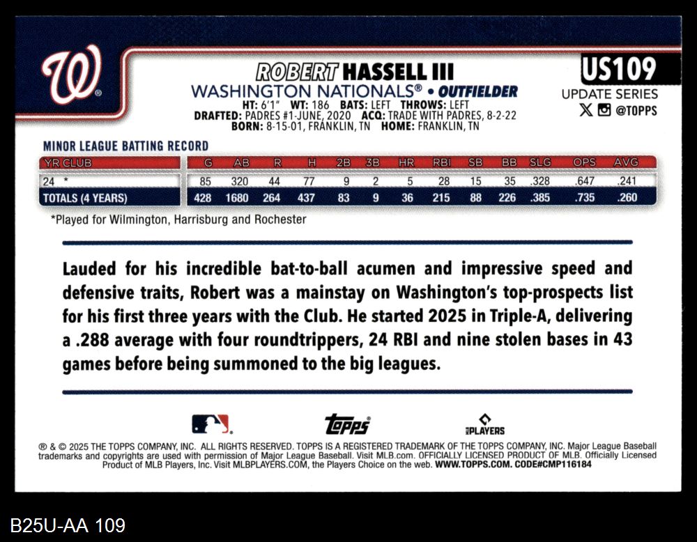 2025 Topps Update #109 Robert Hassell III