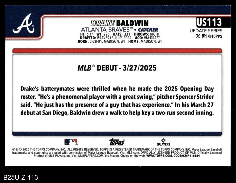2025 Topps Update #113 - Drake Baldwin Rookie Debut 8 - NM/MT