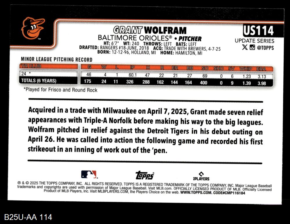 2025 Topps Update #114 Grant Wolfram 8 - NM/MT
