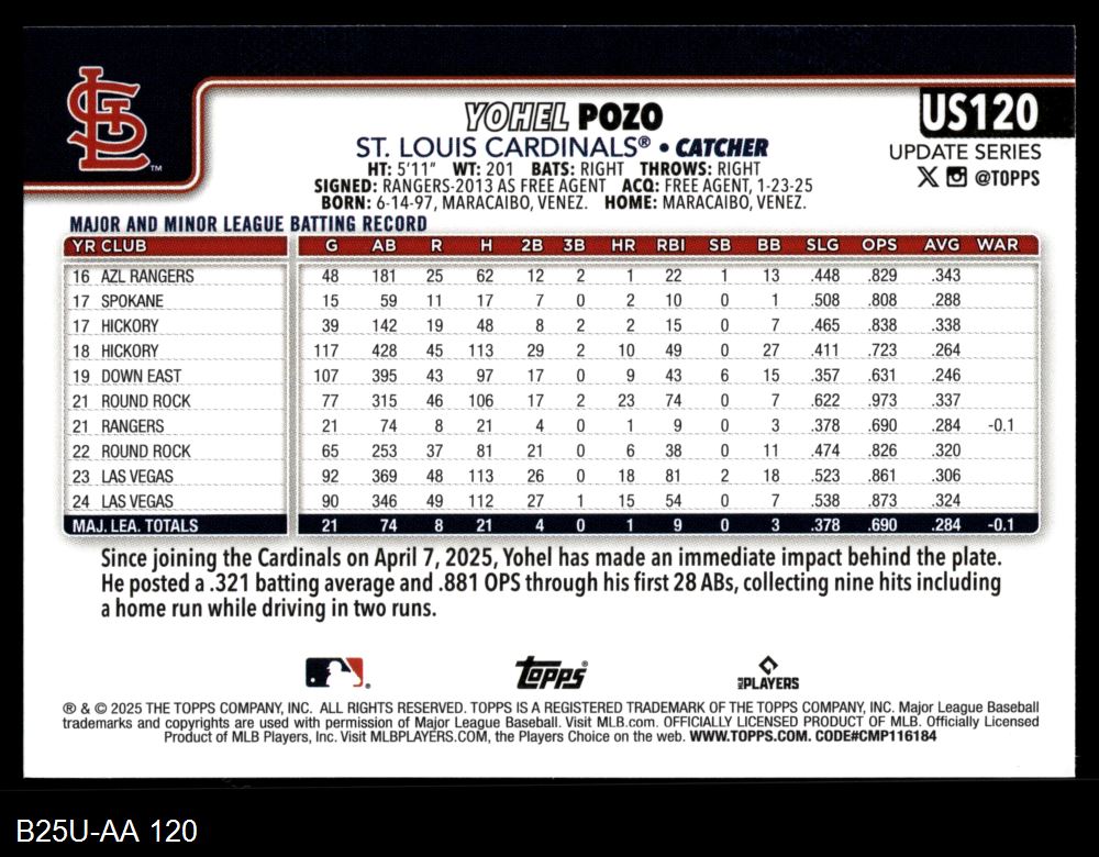 2025 Topps Update #120 Yohel Pozo
