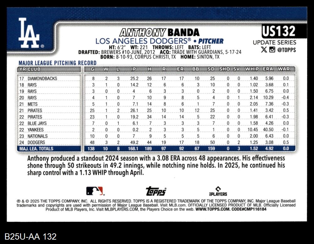2025 Topps Update #132 Anthony Banda 8 - NM/MT