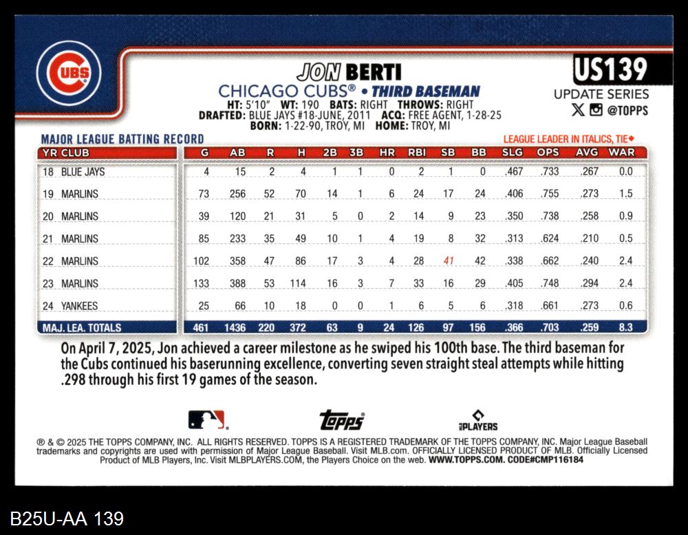 2025 Topps Update #139 Jon Berti
