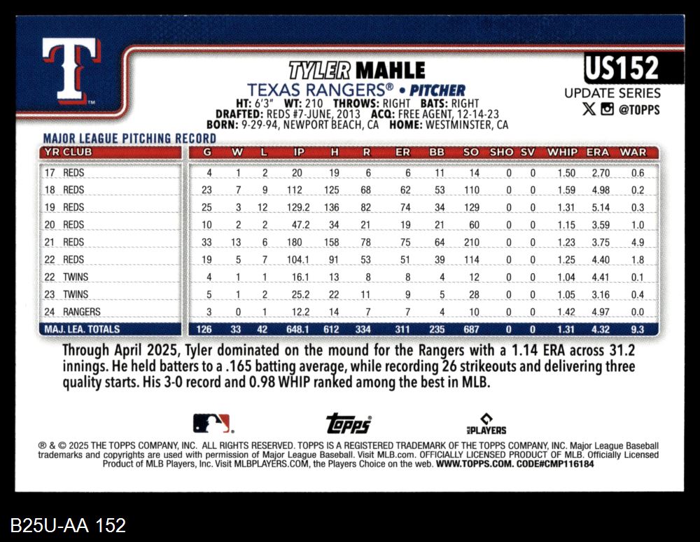2025 Topps Update #152 Tyler Mahle