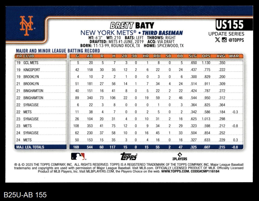 2025 Topps Update #155 Brett Baty 8 - NM/MT