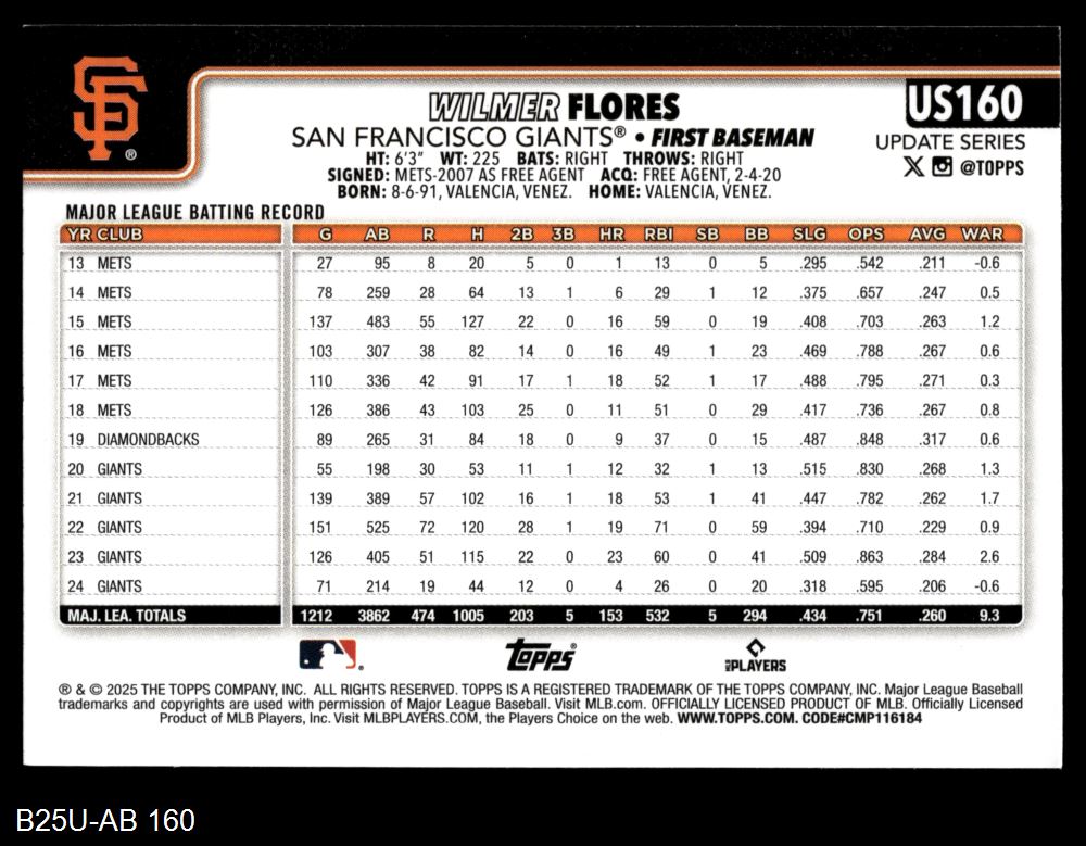 2025 Topps Update #160 Wilmer Flores