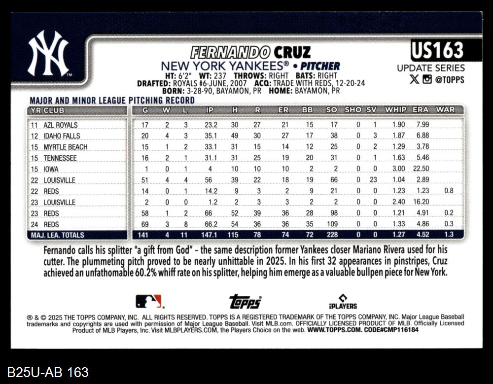 2025 Topps Update #163 Fernando Cruz 8 - NM/MT