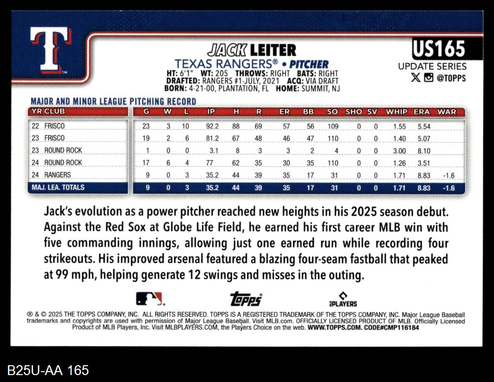 2025 Topps Update #165 Jack Leiter 8 - NM/MT